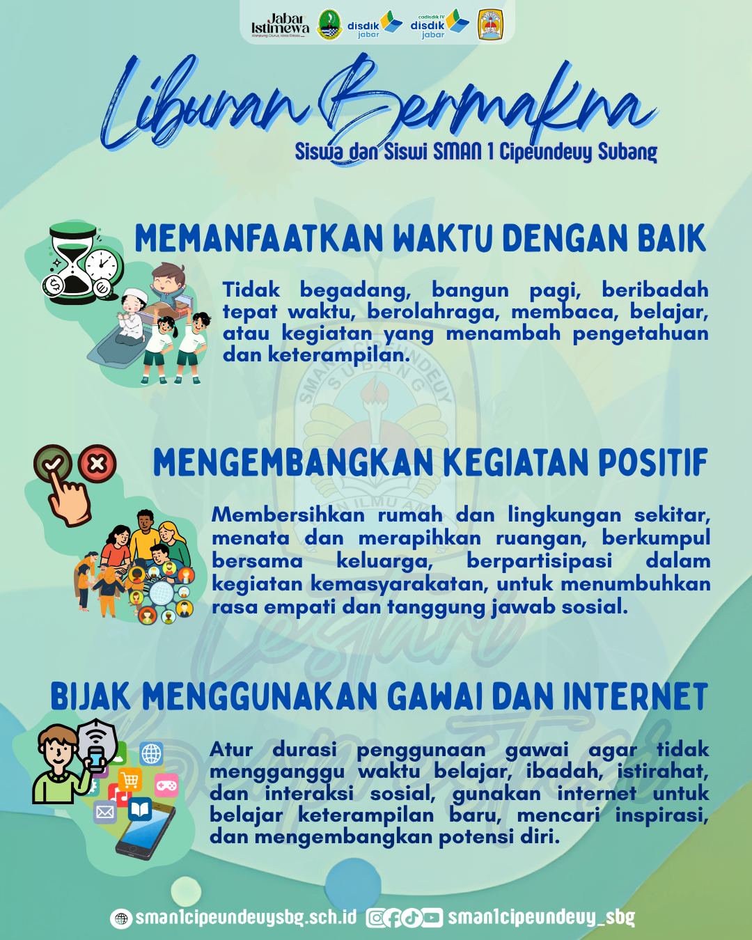 mengembangkan kegiatan positif adalah upaya menumbuhkan kebiasaan yang bermanfaat bagi diri sendiri dan lingkungan karena kegiatan positif yang terus dikembangkan akan membentuk karakter, meningkatkan kualitas diri, dan memberi manfaat bagi orang lain ; memanfaatkan teknologi secara cerdas, bertanggung jawab, dan bermanfaat, akan menambah pengalaman liburan kita semakin bernilai.