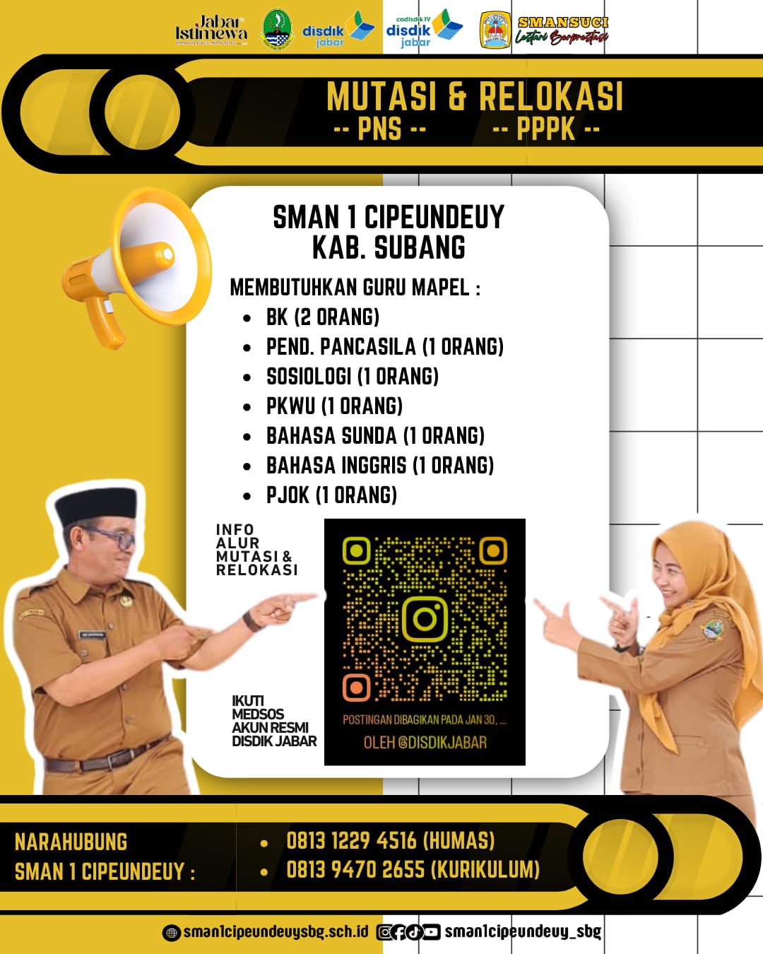 SMAN 1 Cipeundeuy Kabupaten Subang membuka kesempatan bagi Aparatur Sipil Negara (ASN) baik PNS maupun PPPK yang berminat untuk melakukan mutasi atau relokasi penugasan.