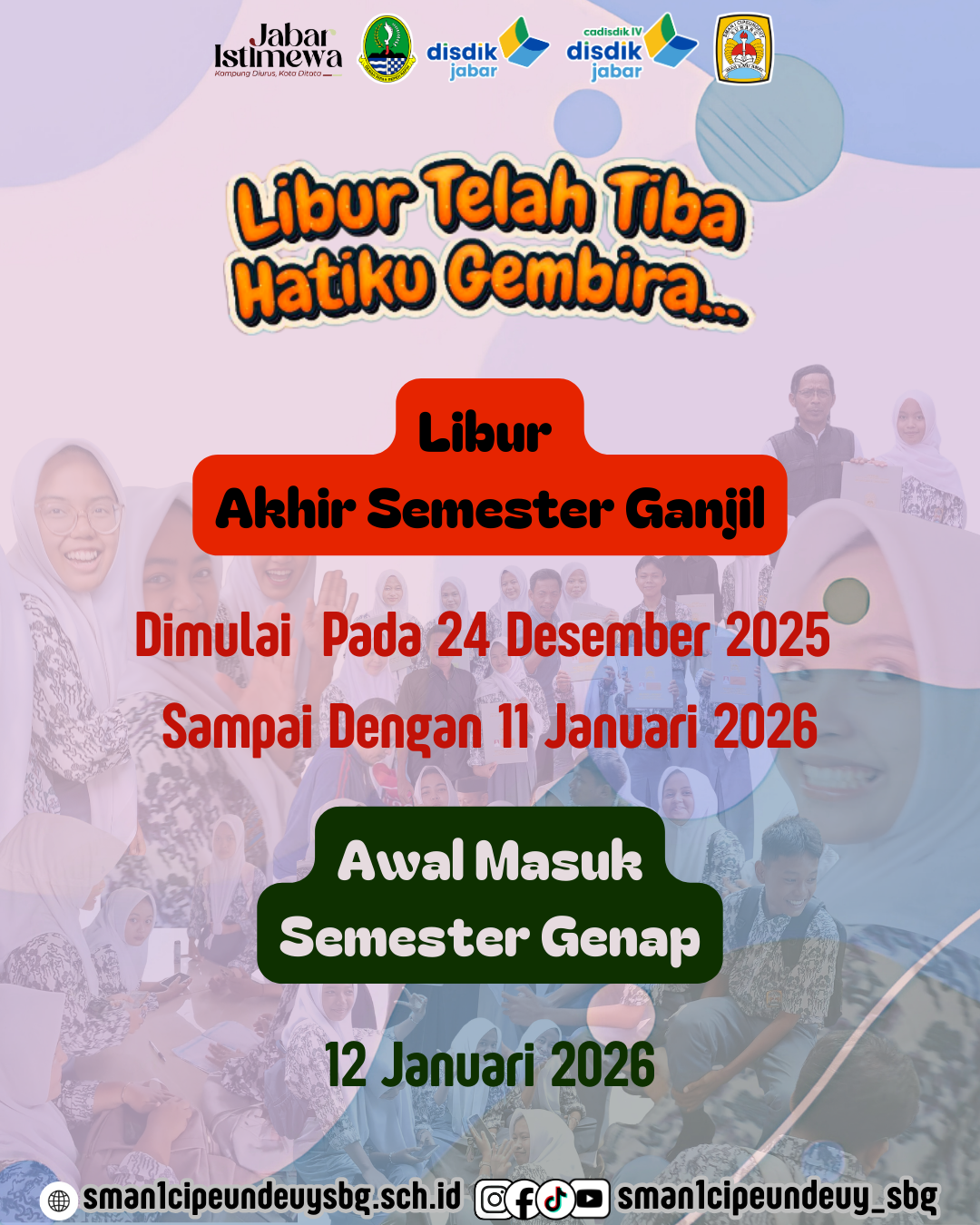 Liburan menjadi waktu untuk menyegarkan pikiran, menumbuhkan semangat baru, dan kembali ke sekolah dengan energi serta motivasi yang lebih baik. Tetap jaga kesehatan, keselamatan, dan semangat belajar di mana pun berada.
